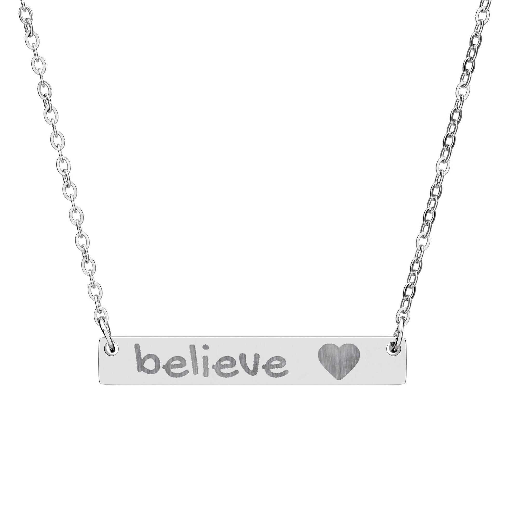 A slim, engraved horizontal bar necklace that reads “believe” with a small heart—finished in polished stainless steel or warm rose gold. Lightweight and low-profile, it sits close to the collarbone and carries a quiet, everyday optimism. The laser-etched lettering has a handcrafted feel while remaining permanently set into the 316L surgical-grade steel. Wear it alone for a subtle statement or layer it with longer chains to add a personal, hopeful accent to your daily look.