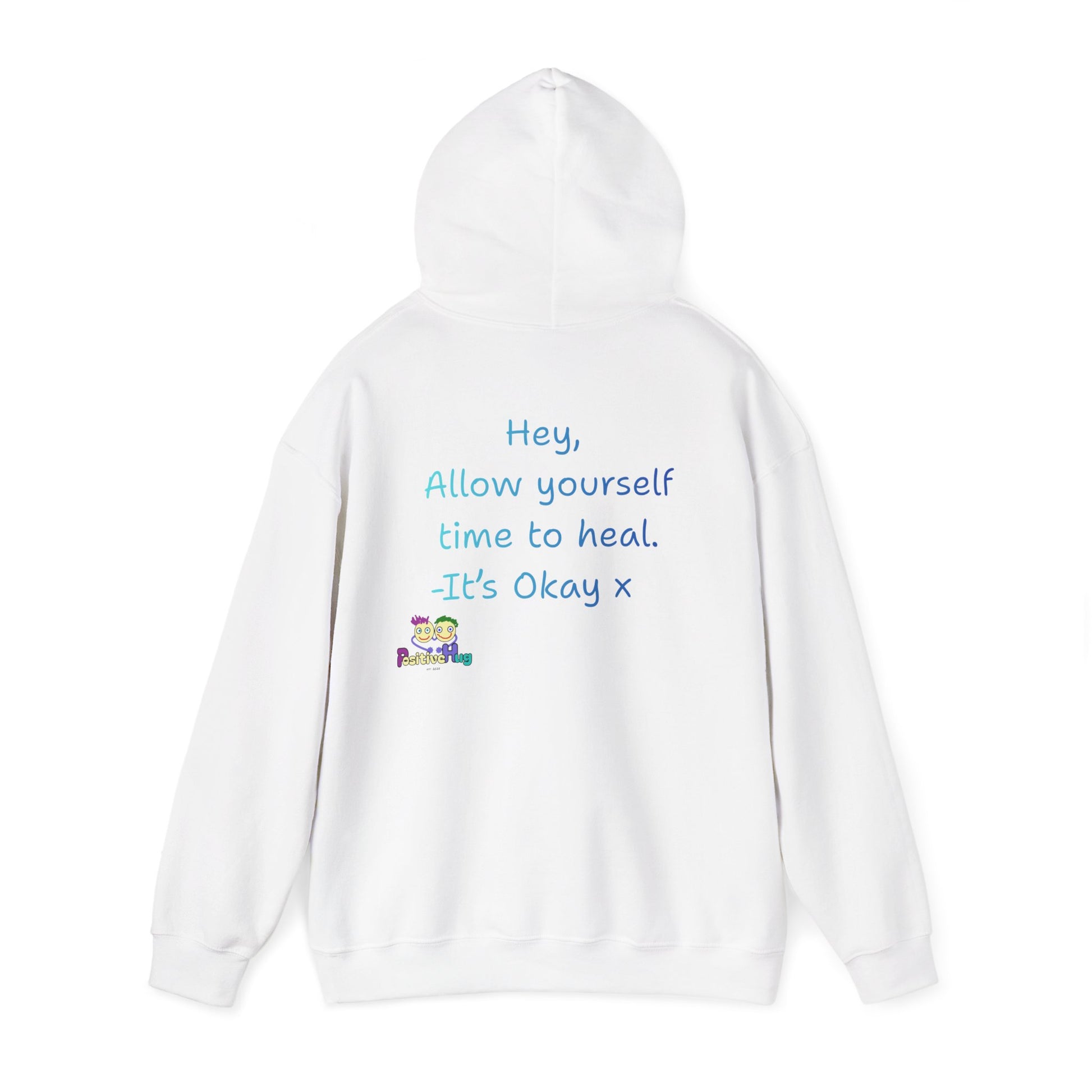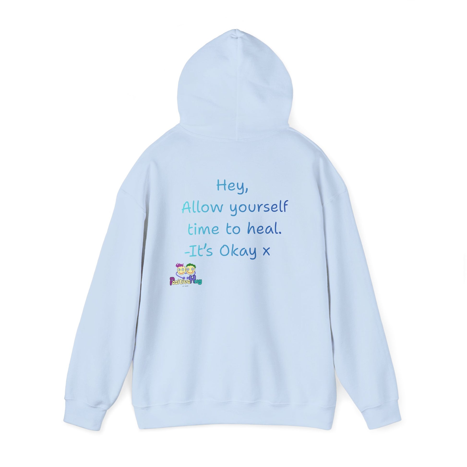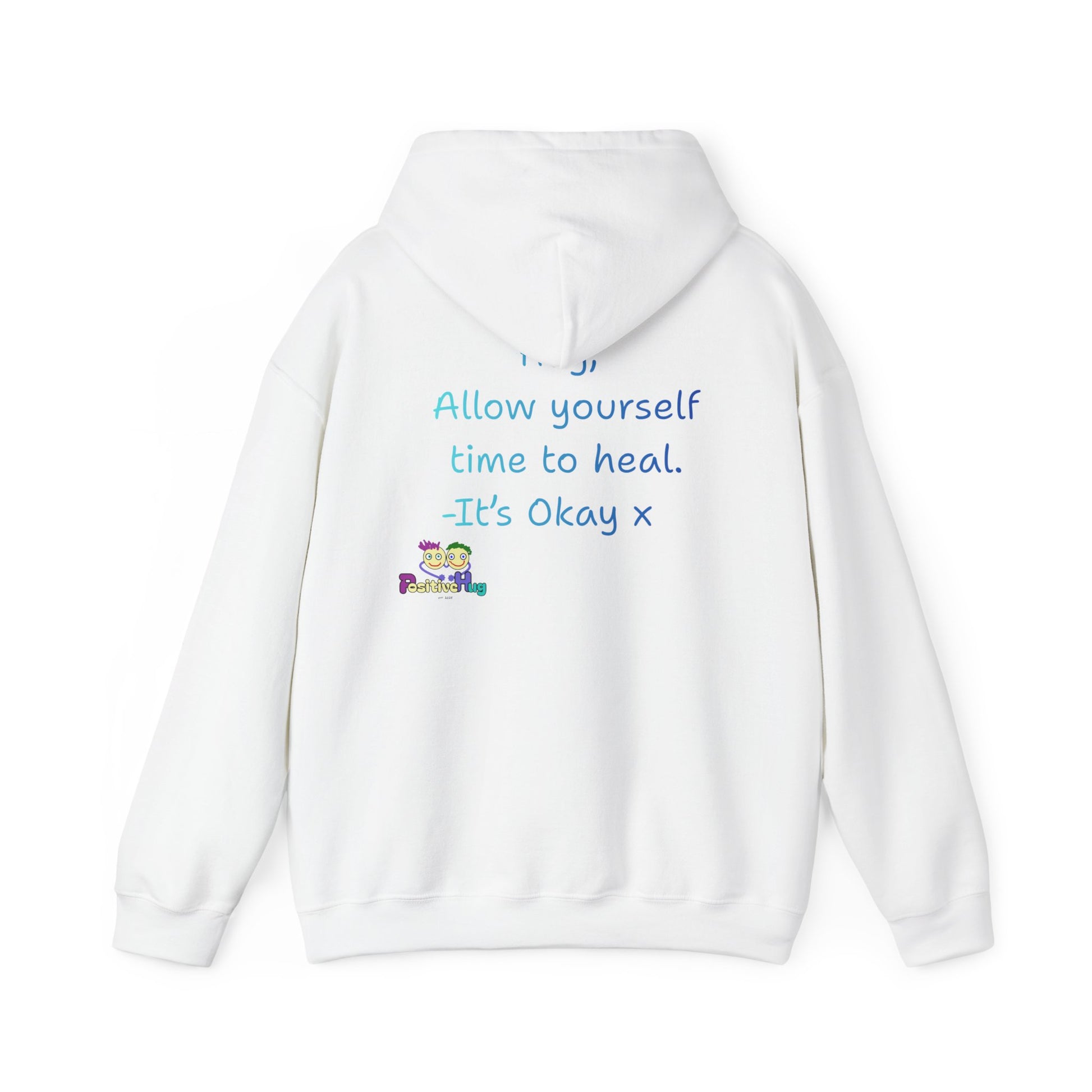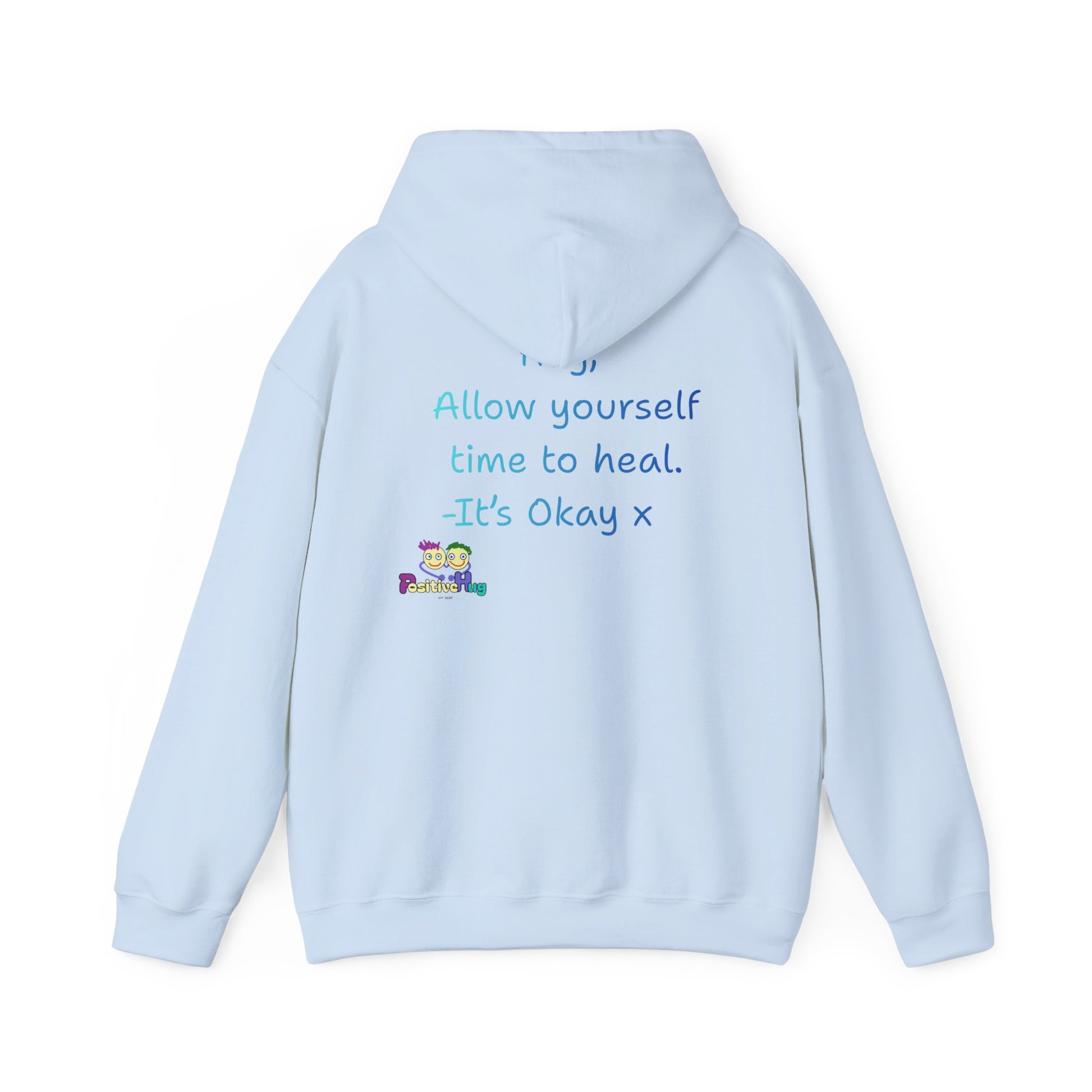 'Hey, Allow yourself time to heal. It's Okay x ' Unisex Hooded Sweatshirt by PositiveHug - Design on back