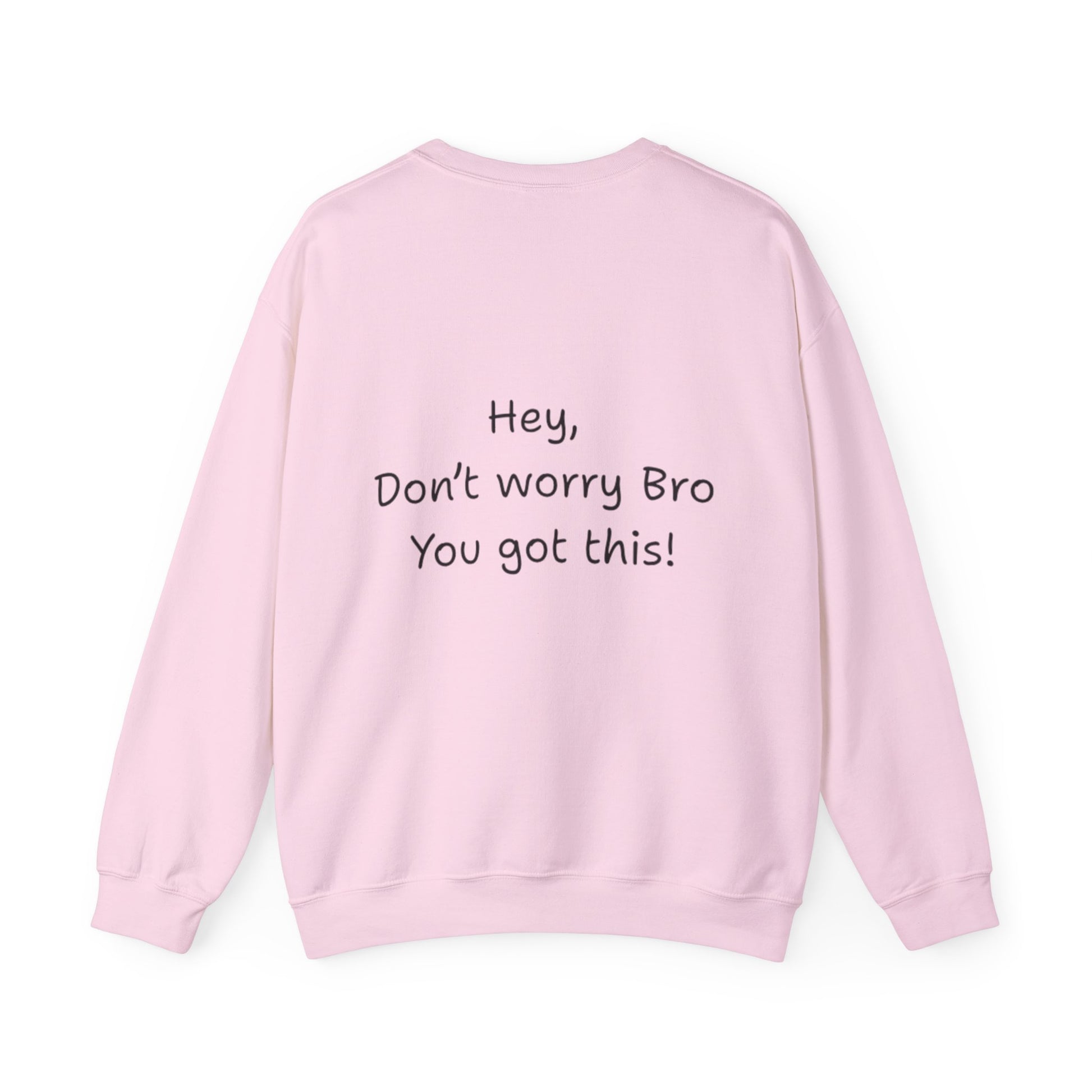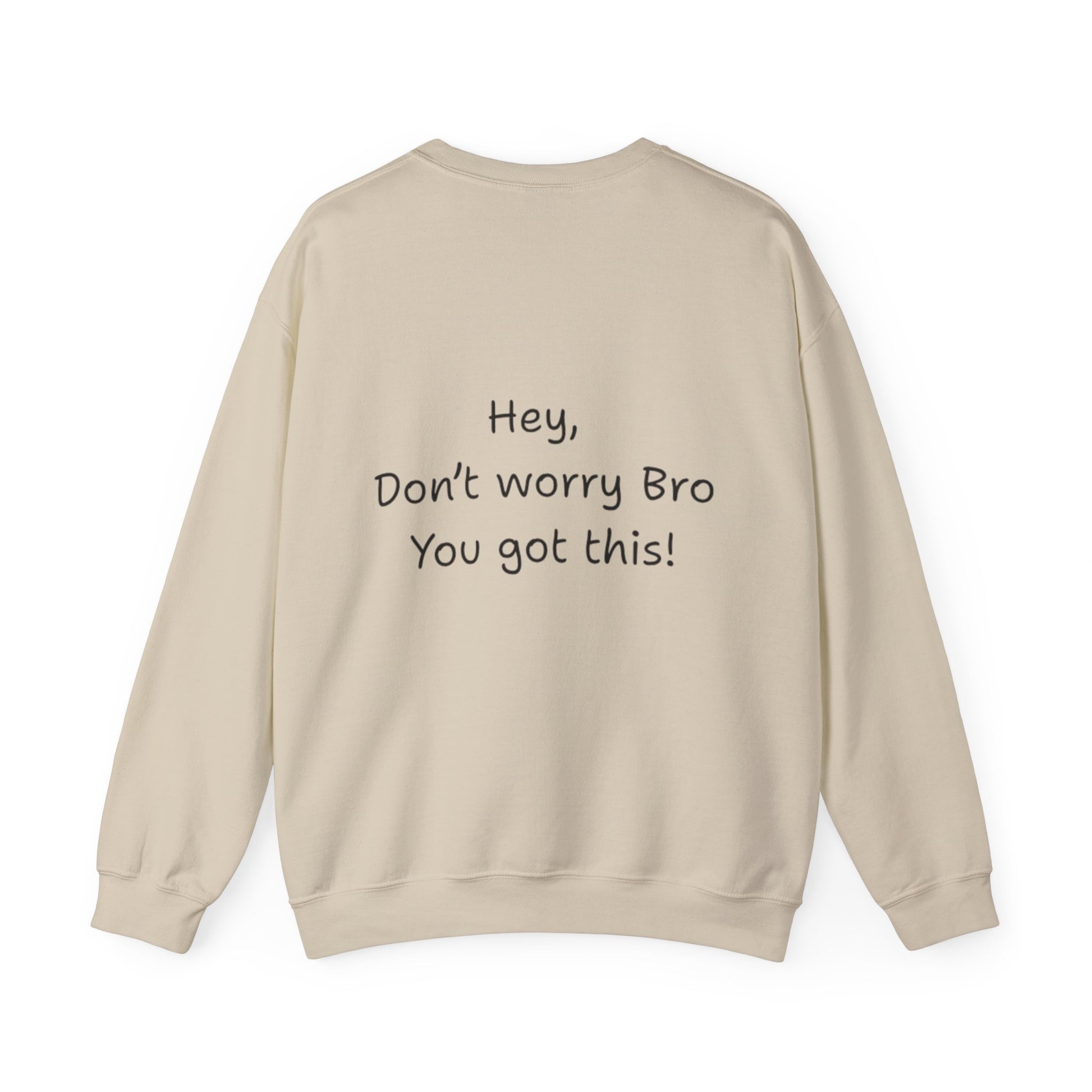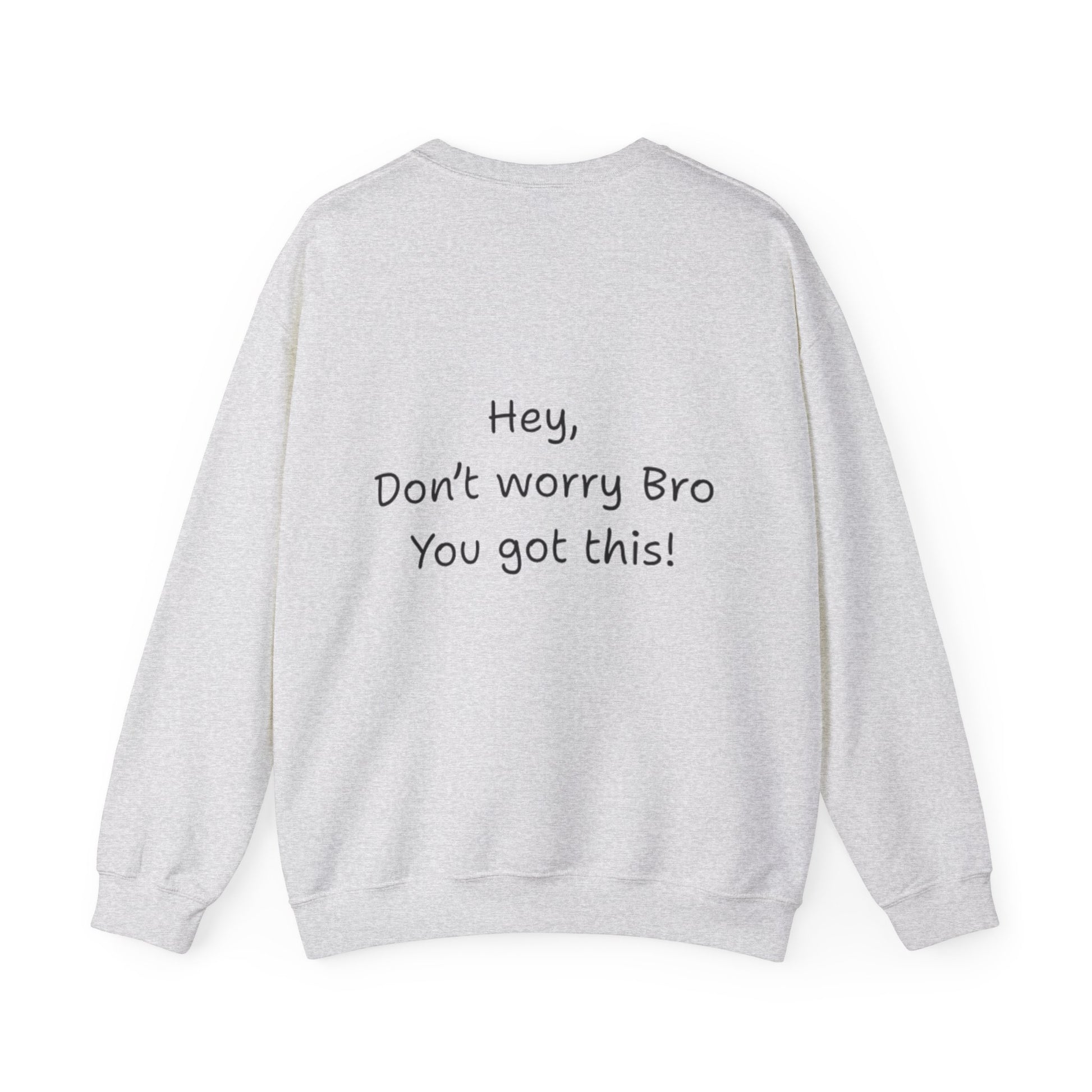 'Hey, Don't worry Bro, You got this! ' Motivational Crewneck Sweatshirt, Design on back Unisex Sweatshirt