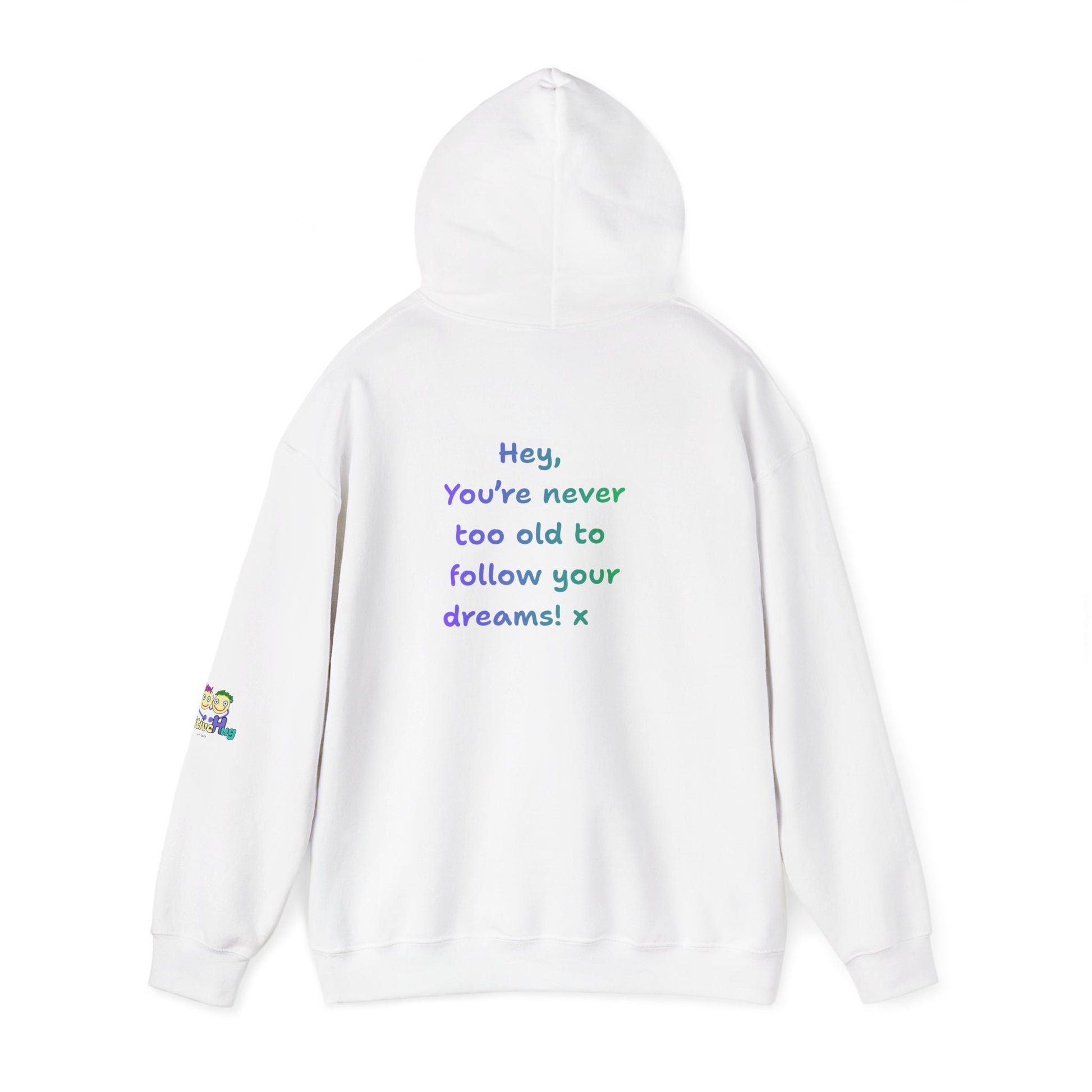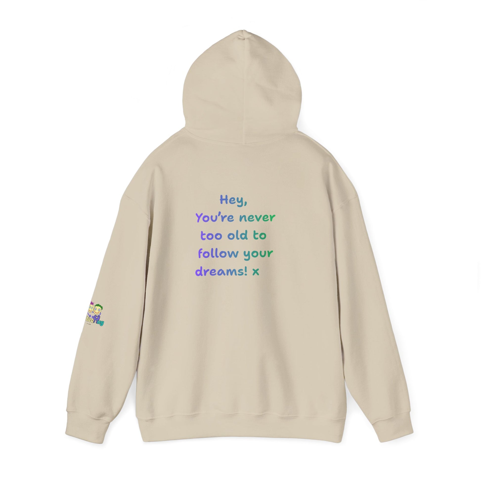 'Hey, You're never to old to follow your dreams! 'x Unisex Hooded Sweatshirt by PositiveHug - Design on back
