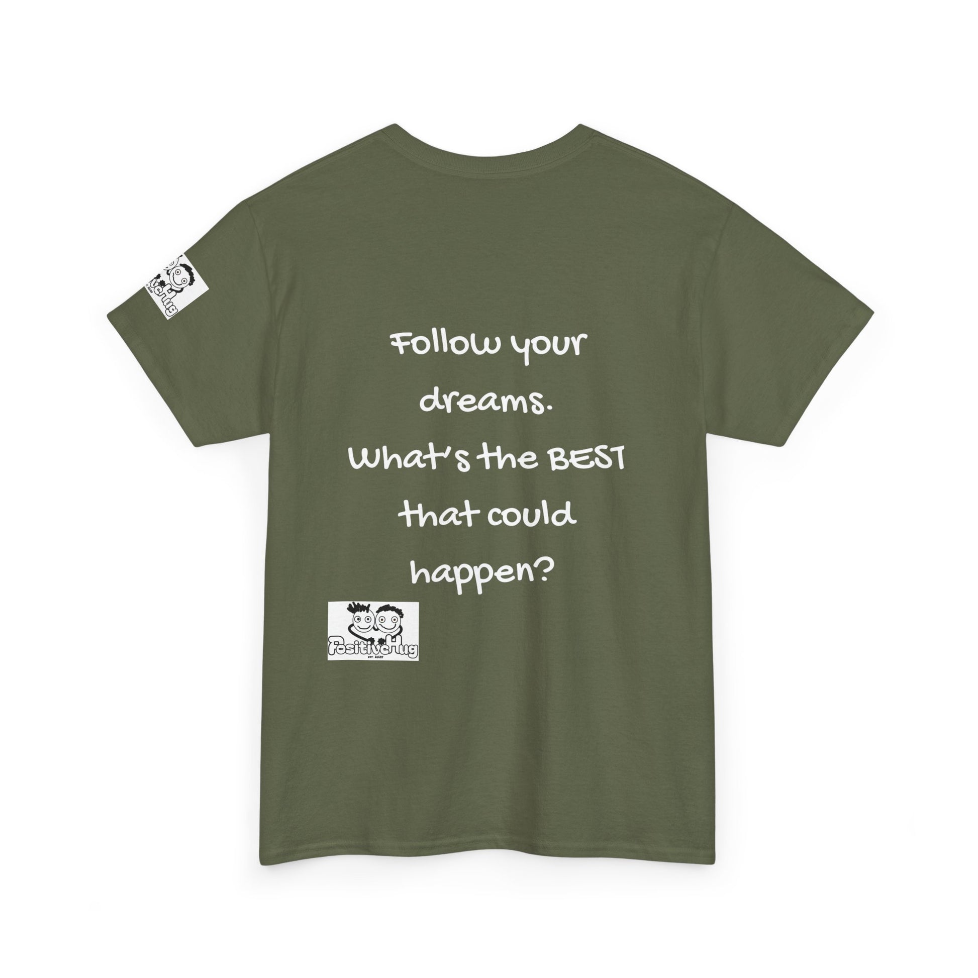 This soft, sturdy cotton tee carries a quiet, uplifting message for anyone chasing creative goals. The relaxed crew silhouette sits easily through long days — layered under a jacket or worn solo — while the bold back text reads like a private pep talk: “Follow your dreams. What’s the BEST that could happen?” Small printed details on the sleeve and lower back add a hand-drawn, personal touch. It feels like the shirt you reach for before a big studio session, an open-mic night, or a morning when you need a little extra courage.