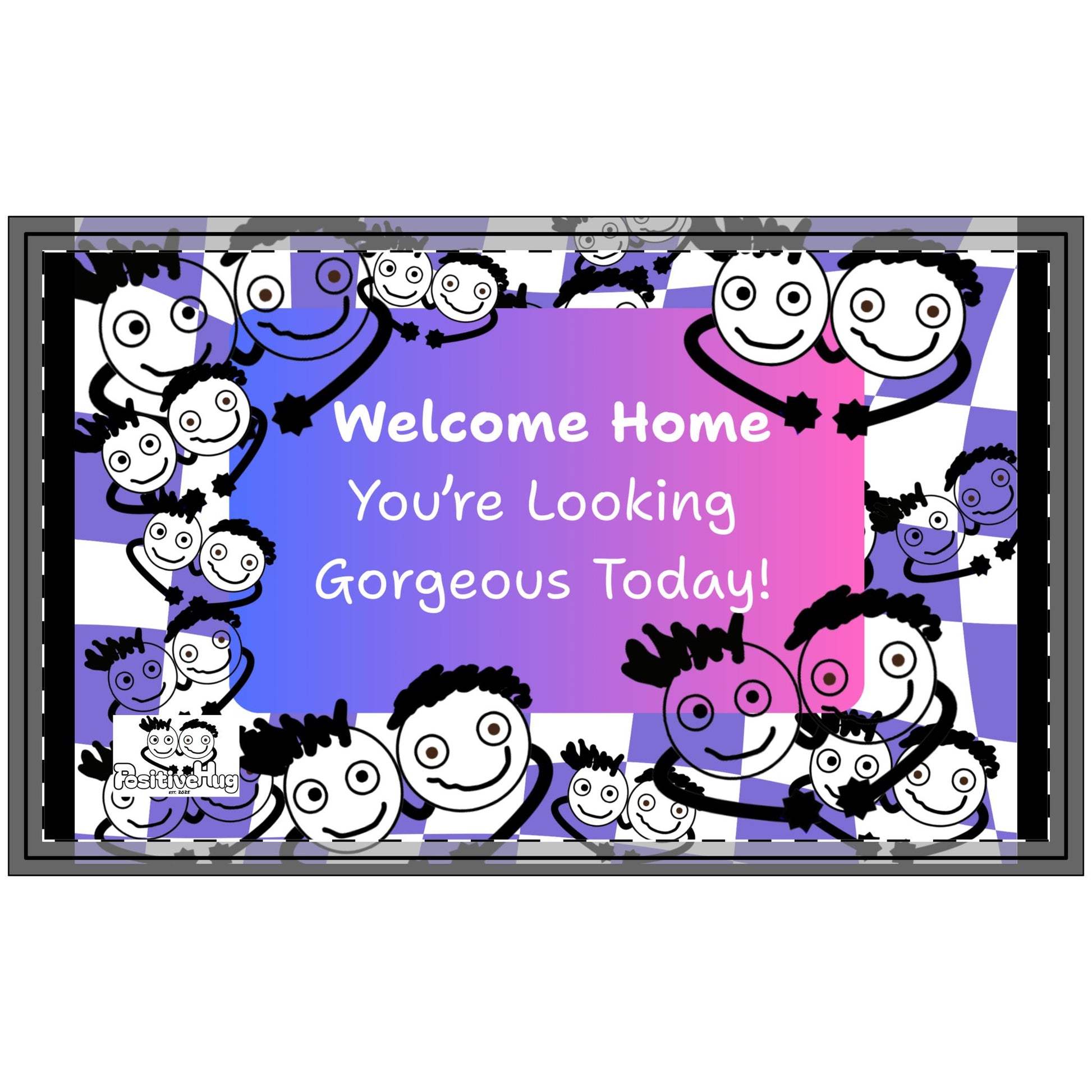 'Welcome Home, You're Looking Gorgeous Today!' Happy Playful Neon Door mat by PositiveHug